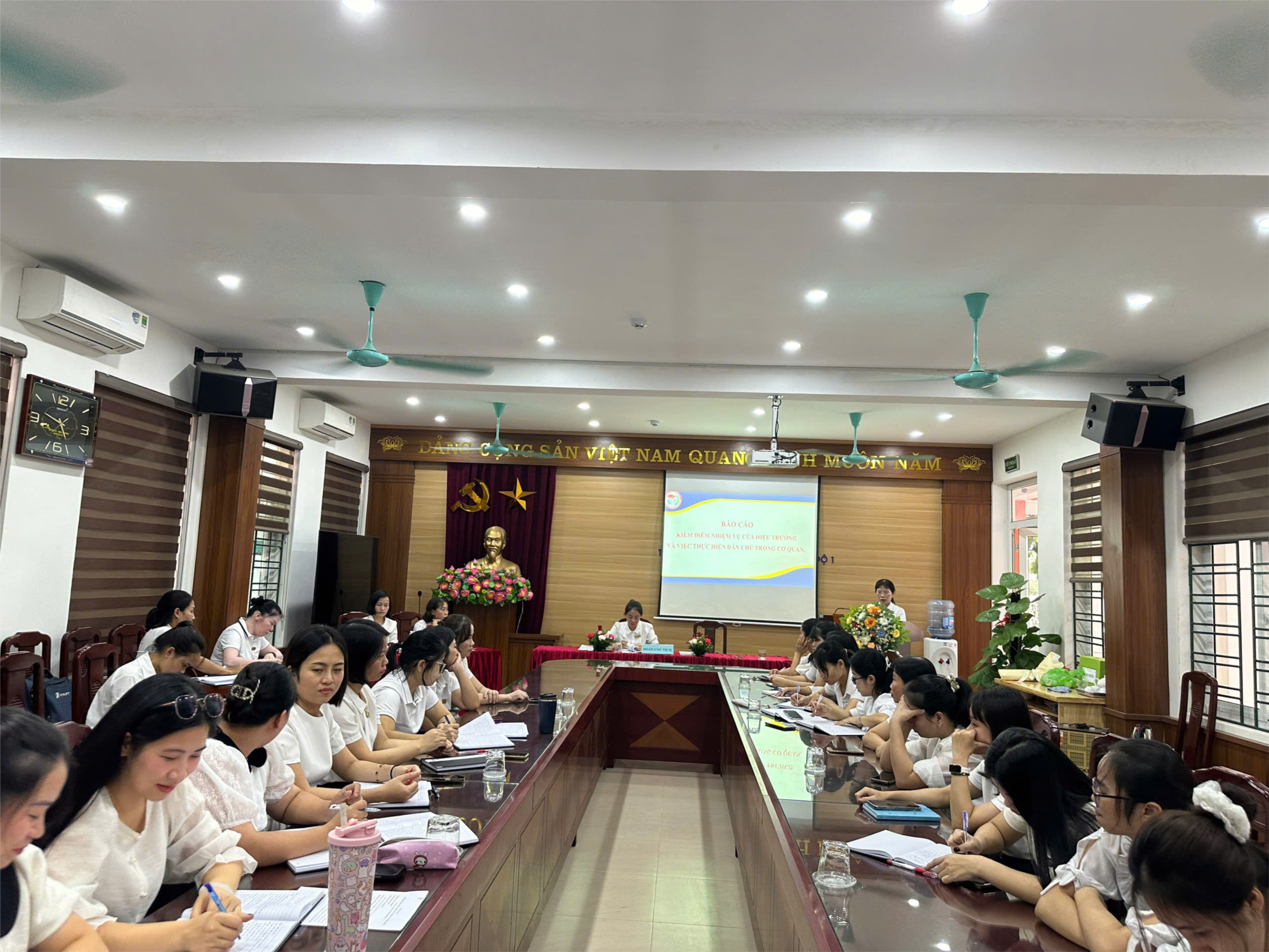Phát biểu tại Hội nghị, Đồng chí Lê Lệ Hằng –Bí thư chi bộ, Hiệu trưởng nhà trường biểu dương những thành tích mà hội đồng sư phạm đã đạt được bên cạnh đó cũng như chỉ ra những hạn chế còn tồn tại trong năm học qua. Trước hội nghị đồng chí đã yêu cầu các CBGVNV cùng nhau nêu cao vai trò trách nhiệm tự học tập, tự bồi dưỡng để nâng cao trình độ, góp phần tích cực vào sự nghiệp giáo dục của nhà trường.
